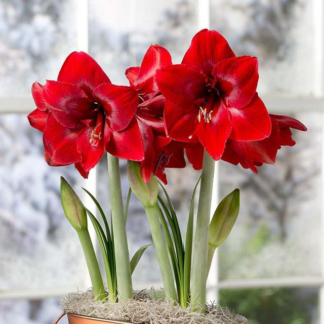 朱顶红是一种球根花卉,它的花朵开放的时候,十分硕大,红彤彤的很鲜艳,让人感觉很喜庆。不仅如此,它的寓意和它的名字有关,朱顶红三个字的谐音就是注定红,意味着全家红红火火,并且它还特别好养,养在一盆年年开花,并且种球自己会繁殖,越养越多。