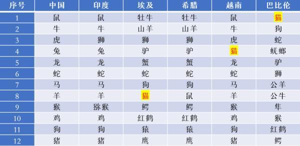 可以看到,在埃及、越南、巴比伦等国家的生肖记录中,猫也有自己的一席之地。