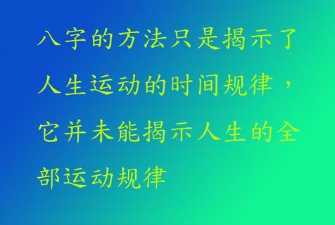 首先,我们在前面已经指出,八字的方法只是揭示了人生运动的时间规律,它并未能揭示人生的全部运动规律。人生的运动规律,还包括空间运动规律和社会运动规律,这些都不能通过八字的理论与方法来反映。因此,八字的理论与方法,从其根本上来说,它们并不能揭示人生的所有活动规律,只能反映人生的部分运动规律,它们并不能限定人生的方方面面。