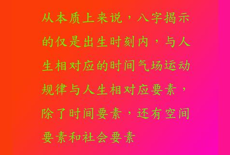 从本质上来说,八字揭示的仅是出生时刻内,与人生相对应的时间气场运动规律与人生相对应要素,除了时间要素,还有空间要素和社会要素。而八字方法不能有效地揭示出空间气场的运动规律,社会规律在八字中更无法有效地反映出来。对于一般的物体运动来说,时间和空间因素是至关重要的,掌握了这两大因素,就可以充分地把握事物的运动规律。对于人类来说,光有时间和空间要素是不够的,因为人是社会性的动物,人有意识,人类社会有其必然的运动规律,所以,要全面地揭示人的一生就一定要充分考虑人的社会规律,把时间运动规律、空间运动规律和社会运动规律三方面结合起来。