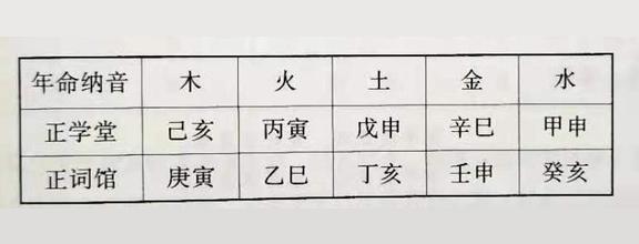 学堂词馆均以年柱纳音查月、日、时柱,学堂即年命纳音长生之地,如丙午年生人纳音为天河水,月支见申,因申为水之长生,故申即是学堂;若月柱为甲申,因甲申纳音为泉中水,与年命纳音五行同,便为正学堂;词馆以年命纳音见临官即是,其理与学堂同(有的书中以十干查词馆有误,请读者注意鉴别)。列表于下: