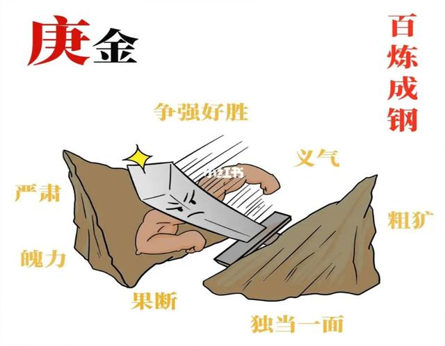 说说我对庚的理解,庚是天干的第七位,是甲木的七杀,是甲木是一种克制的力量。我们在理解十天的时候,不要把它们简单的看成五种物质,而要把它们看成五股气。这五股气的相互制约或者运行就运化成不同的生命状态,那么庚金就是具有变革、肃杀的气。