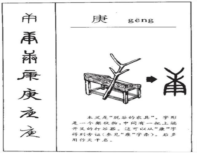 今天讲十天干的七位,庚。假如大家都没有学习过五行知识,你能想到庚的五行吗?单独一个庚字,我们无从准确的知道它的含义。有人认为庚在古代一种金属的乐器,庚的甲骨文就很像一个铃铛。是“钲”,是一种铜做的乐器,通常是在行军打仗时用的。钲鼓在古代是军事的代称,钲歌是君越的代称。也有人说庚在古代是一种脱谷的工具,也是金属做的。还有一种说法是庚是“更”,改变,庚新的意思。《说文解字》:庚位西方,象秋时万物庚庚有实也。不管是哪一种说法庚的共同属性是金。