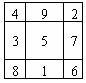 洛书以点表数,奇数以白点,偶数以黑点,共45个黑白点。古人将洛书演化为九宫,九宫图如下:
