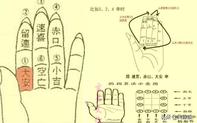 小六壬预测方法十分简单,预测时只须提取当时的月、日、时信息,按照一定的推算规则,用左拇指在六个掌诀位上按顺时针方向依次掐算即知结果。其法以大安起正月,月上起日,日上起时下面详解推算方法。