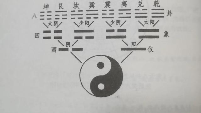再从四象的位置来看,一为太阳、二为少阴、三为少阳、四为太阴。再将《河图》横列的九四三八次序来看,其中数之十减九为一、数之五减四为一,其中一数为太阳,故乾卦与巽卦同根于太阳,中数之十减八为二、中数之五减三也为二,二数为少阴,故离卦与震卦与少阴同出一源。再将《河图》竖看,中数的十减七为三、中数的五减二也为三,三是少阳,于是坎卦与离卦与少阳同出一之源。继将中数之十减去六,其数为四,中数之五减一也为四,四为太阴。所以坤卦与艮与太阴同出一源,这就是四象八卦的由来,再将此四象回溯到阳仪上看,则乾兑离震四卦皆由阳仪所生,巽坎艮坤四卦完全由阴仪所生,这就是太极生两仪,四象生八卦的由来。