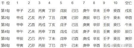 ③得数必是双数,加上前面的单数即可(因每旬“空亡”有两天)。若减后得数为2,必是子、丑空,为4,必是寅、卯空,为6,必是辰、亥空。