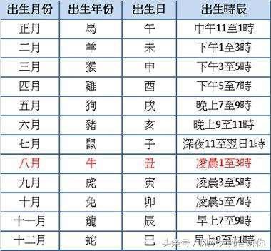以农历生月为主,知道确定自已八字的生月后就以月份为主,查看八字其余年月时下三个地支: