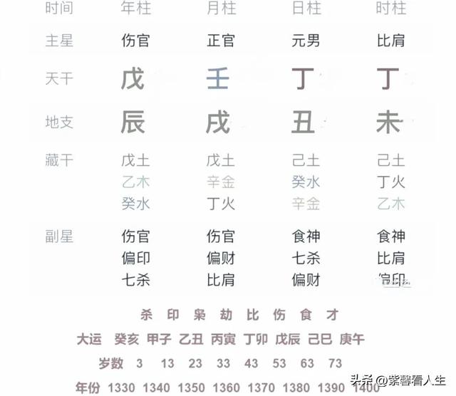 再看看行运,前两步又临亥子水之旺地,这点丁火哪有喘息机会?快灭了都。若论局中火土那么旺就从了吧,但却运行水地,逆局。局中辰戌丑未四库全,如它们为房屋的话,则可见这人四处为家居无定处,而行运上看这又是四处进水呀,哪可为家?这是一个乞丐之命,后又为有饭吃有地方住去做了和尚。