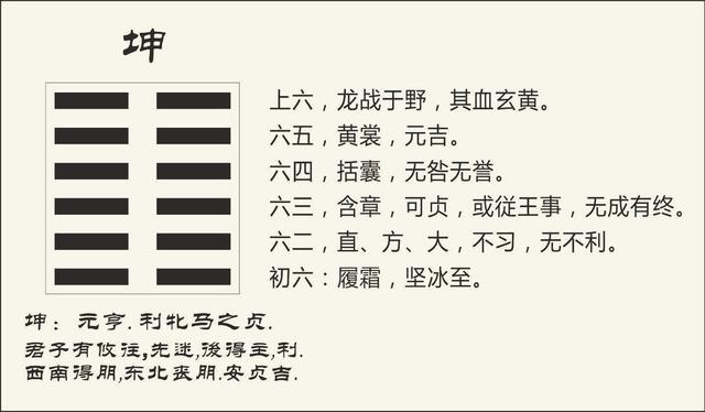 坤卦,其卦象为: ䷁,六爻皆为阴爻,纯阴之卦,其卦辞为:“元亨,利牝马之贞。君子有攸往,先迷;后得主,利。西南得朋,东北丧朋,安贞吉。”卦辞描述了坤象征着大地,是万物孕育的母体,像母马一样,永守初心,“行天者莫若龙,行地者莫若马”,乾卦以龙为象,坤卦则以马为义,所以我们常说龙马精神既是来源于此,龙马精神其本身就是涵盖了乾坤之意,代表了天地之间的纯粹,然后还强调了与人交往要学会让利,若锱铢必较,必定会误入歧途,由于“坤”位于西北的“亥”位,阴气易行,往西南方向,阳气逐渐强盛,阴阳相互中和,必会琴瑟和谐,所以说西南向有朋友,而东北向阳气逐渐散尽,丧朋也代表了此处相冲突。