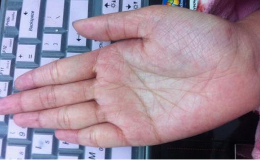 男子的手纹只看得见一条明显的断掌线,其余的纹路都是又多又杂,也比较浅小。由于断掌线比其余的杂线要深刻得多,粗的多,所以命运中虽有困难,但是都是小困境,深刻的主线作用下会逢凶化吉,最终经理艰难困苦之后会大富大贵。