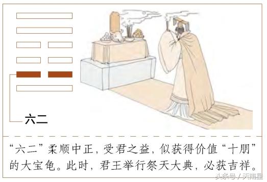 【白话】六二,有人送来价值昂贵的大乌龟,没有办法辞让,遇到这种情况,在任何时候占卜其结坚果永远是吉祥如意的;君王如果在此时祭祀天神,祈求降福保佑,也会如愿以偿获得吉利。