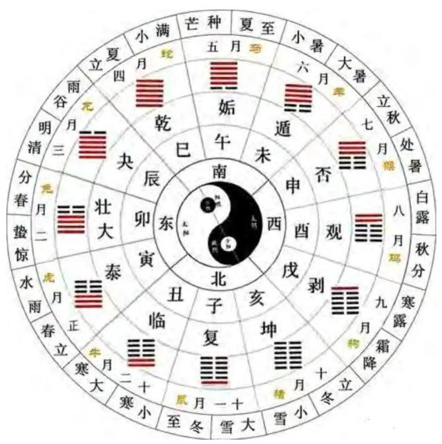 在十月﹝冬至之前﹞,为昼短夜长,阴盛阳衰,故以全阴爻的坤挂代表。而过了冬至后,白天逐渐变长,即阳气日盛,故十一月时,以一阳生之复卦为代表。十二月以二阳生的临卦为代表,余此类推。