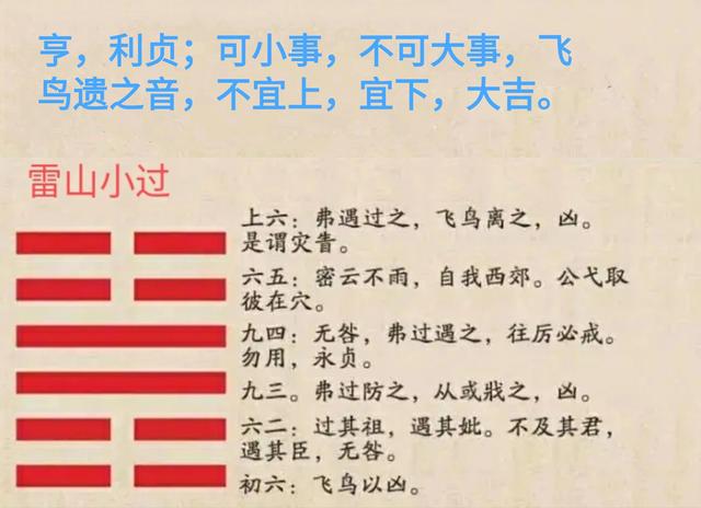 卦辞:亨,利贞;可小事,不可大事;飞鸟遗之音,不易上,易下,大吉。