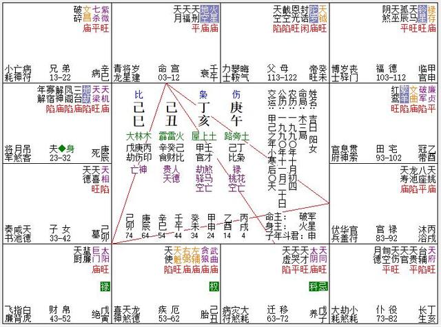 命无主星,受迁移宫的影响很大,太阴化科天同化忌,外在似乎给人一种文静秀气、温和可爱的感觉,但这只是外在,别忘了太阴天同只是一两个主星而已,也不能单宫论述,当借入命宫之后,本身科忌交缠,与火星地空天刑搅在一起,除了情绪化之外,还特别缺乏安全感,心态躁动,快人快语,尽管表现耿爽,但不免言直伤人。另一方面,铃星落入福德宫,受羊陀所夹,无疑给自己的内心筑了一道高高的墙,别人很难走得进去,而自己却徘徊在自我孤独的较劲与钻角尖之间。每每外在激动,内在却憋屈着,非常难受,可以说是一个容易气死自己的人。再者,考虑到疾厄宫的影响,贪狼、武曲化权,加左右天铖在里面,不免倔强任性,掌握欲强烈,直来直往,不易妥协,喜好吃“糖衣炮弹”,对她的情绪变化要做足“哄疼”功夫,懂得忍耐。