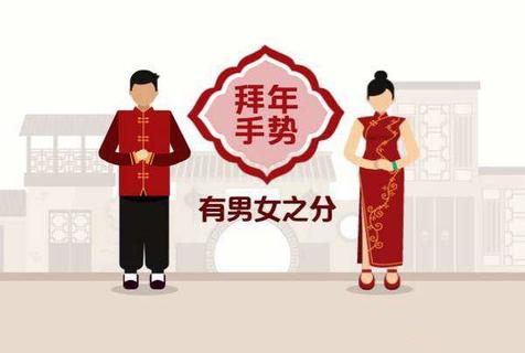 男子拜年手势是,右手成拳,左手包住,因为右手是攻击手,包住表示善意;女子正好相反,左手成拳,右手不抱拳,只压手。