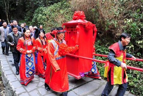 3、乡村婚礼中有举行拜堂仪式,新娘敬公婆改口,礼成送入婚房。