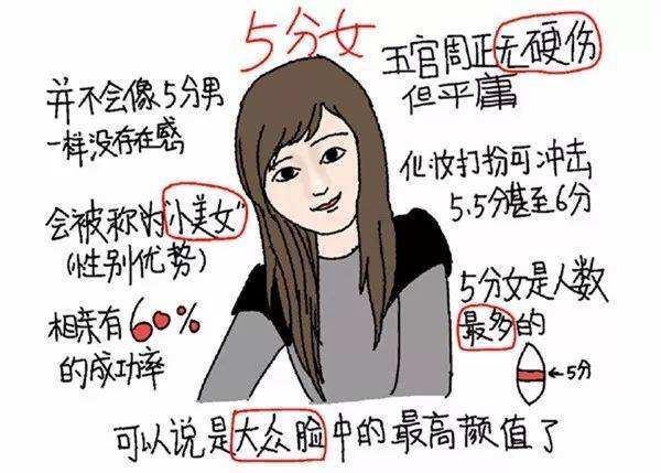 下面是女生相貌打分的5分女漫画,可以理解成前15%,70分-85分之间。