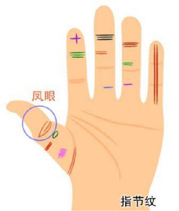 在大拇指第一节指节上面的指纹,呈一个圆圈形的纹路叫做凤眼纹,通常有凤眼纹的人会得到一个好老公和好老婆,彼此敬爱,因此一生衣食无缺。