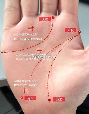 1、井字纹在天纹之上时,天纹就是感情线,预示你后期有很好的事业,能成为领导级人物。