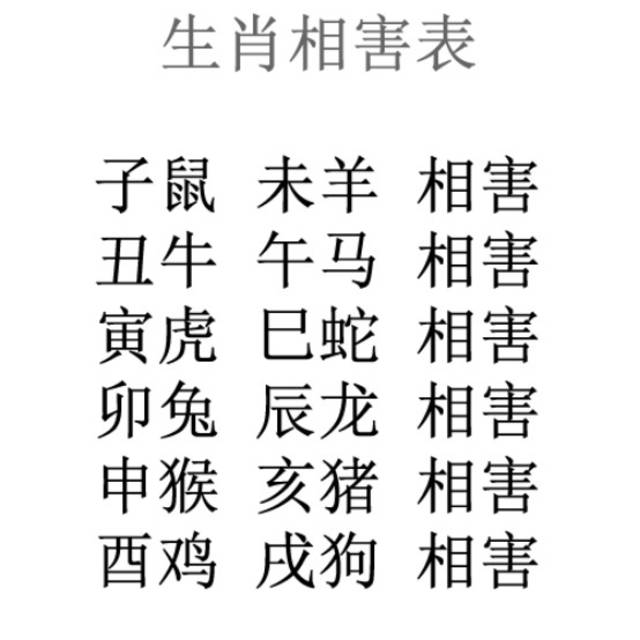 相害:就是有加害的意思了,如果有相害的属相结成恋人或夫妻,会无事生非,经常吵架,影响感情,有的最终走向分手或离婚。