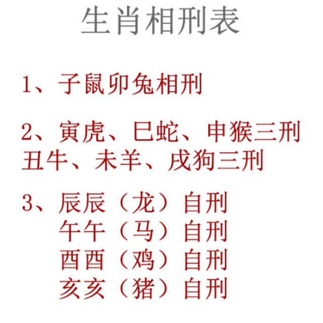 相刑:指不同属相之间的刑克,传统上认为,刑的力度要比冲害大一些。比喻起来,如果说冲只是吵嘴,害就是伤害,那刑则是动手打架了。