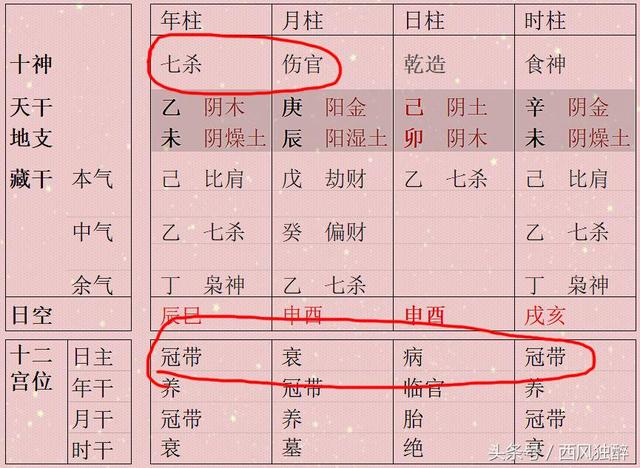 上面这个八字,日主身弱,四柱全然无帮扶之意,看似要从七杀,但因为有月令劫财帮扶难以相从。这就好像有一个人要应聘去一个公司上班,但是旁边总有人对他说:“我能帮你找个更好的,这个不要去”,结果好的公司没找到,前面的一个也耽误了。但是,这个八字虽然看似很差,却仍然衣食无忧,原因就在于时干的食神天厨被座下的比肩生扶为强,日主又处于“进神旬”,虽然苦难重重却不忘艰苦奋斗,碰上好的大运则终有出头之日。