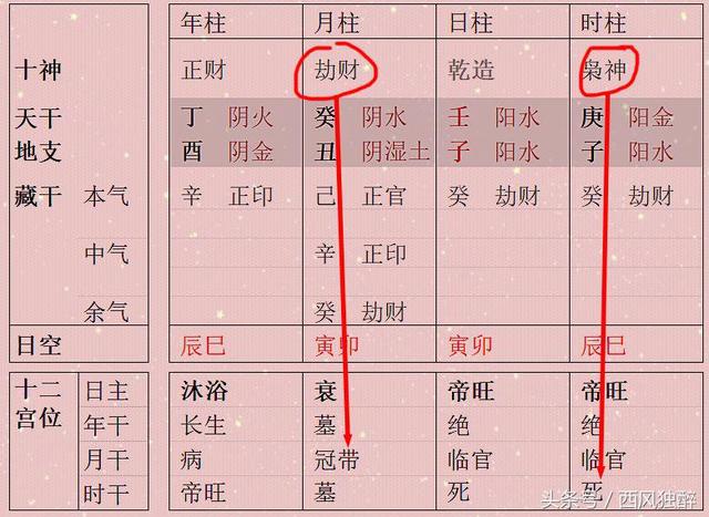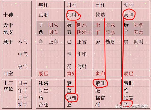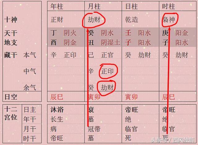 对于得势的八字,不是说有印星或者比劫就会很强,还要看这些比劫和印星自己是否旺。比如上面八字,劫财在月令透干后坐“冠带”,所以算是中旺;时干上的印星坐死地,所以为弱。也就是说,这个八字中的劫财可以帮到日主,但是枭神本身就弱,对日主的帮扶有限。(枭神不是临“帝旺”,“帝旺”是日主在时柱的状态而非枭神的状态,这点一定要区分开)