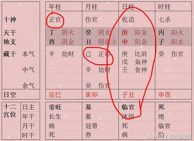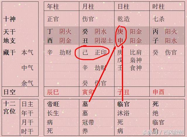 我们再看一个八字。这个八字中,日主庚金自坐申为临官得禄,所以是得地自旺(虽然不得令,但是能得地的八字都以旺看)。月令上正印己土在丑逢墓为弱,难以帮扶到日主;年干比劫酉金也在弱地,也无法帮扶日主,所以此八字可以认为是日主虽然得势但是却无法得到这些“势”的“力”。