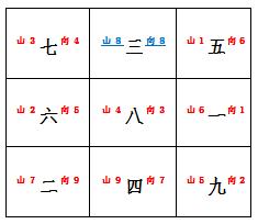 对宫合十——飞星盘中坐山与立向两宫运星数合十。