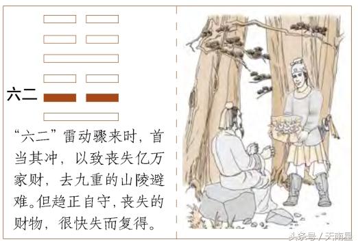 【白话】六二,惊雷震动,有危难;丢失大量金钱,应当攀登到高高的九陵上边去躲避,不去追寻它,待到七天自会失而复得。