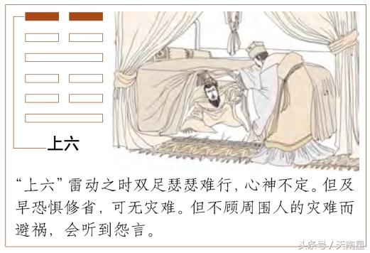 【白话】上六,由于雷震动恐惧而畏缩不前,两眼旁视而不安,如果行动就会有凶险;不过,当雷震还没有到达自己身上时,就早作戎备谨慎行事,则不致受害;涉及婚配之事则将会产生言语纷争。