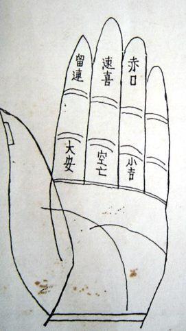 食指指根为大安,食指指尖为流连,中指指尖为速喜,无名指指尖为赤口,无名指指根为小吉,中指指根为空亡。