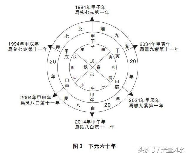 每过三个甲子,即为三元,分为上元、中元、下元。每一大运六十年分三个小运,每个小运二十年。上元包括一运、二运、三运;中元包括四运、五运、六运;下元包括七运、八运、九运。三元九运共一百八十年。