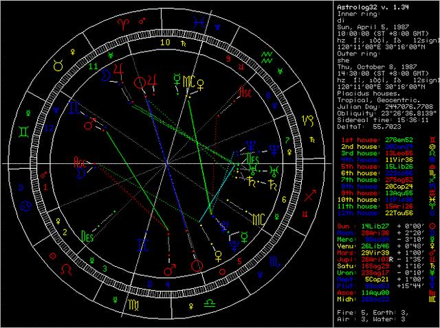 分析合盘需要对个人星盘有完整的解盘技巧为基础,比较元素与性质的比例,行星在宫位上的分布,及上升下降、中天、行星之间的各种相位。