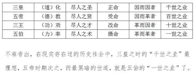 从三皇到五伯(这里的"伯"通现代汉语"霸",指的是春秋五霸),采取的执政纲领分别是(道)化-(德)教-(功)劝-(力)率,而毫无疑问,这是一个节节倒退的顺序。因为他说:"尽物之性者谓之道,尽物之情者谓之德,尽物之形者谓之功,尽物之体者谓之力。尽人之圣者谓之化,尽人之贤者谓之教,尽人之才者谓之劝,尽人之术者谓之率。"同时,四种不同的政治纲领决定了国祚的长短,即一个朝代的"命":