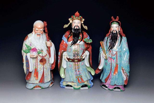 俗云福禄寿三星,他们以三位一体的形象出现:中间是赐福天官,手执如意;右为禄星,作员外朗打扮,头上插戴牡牡丹花,怀抱婴儿;寿星在左,即南极仙翁,广颜白须,执杖棒桃,笑容可掬。禄星是中国民间信仰中主管功名利禄的星官。