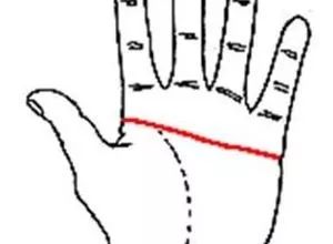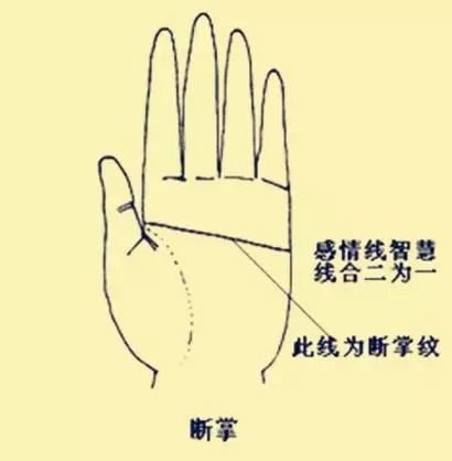 生命线、智慧线、感情线三条线的起点相互交接,或连成横切过手掌的直线。 如其中两大掌纹线,即感情线和智慧线合二为一,横贯于手掌中,好像一条横纹将手掌分开二部分似的,那么这就通常说得断掌,手相学中叫做“通贯手纹”。