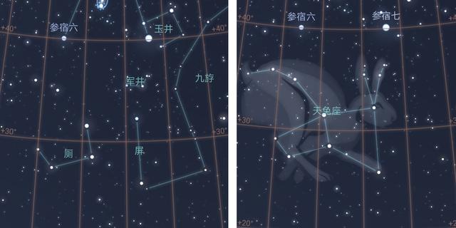 欣赏完参宿,目光向下游移,我发现了一组从未看到过的亮星,摆成梯形的形状,非常显眼,但平常用肉眼是完全看不到的,从未注意过。借助手机软件,我得以获知这是肥嘟嘟的天兔座的身体部分(右图中的梯形),并且进一步地找到了天兔的2个竖起的耳朵以及翘起来的小尾巴。当我将星空文化调为中国传统时,有趣的事发生了,天兔座是由三个中国星官组成的——中国人认为兔子的2个耳朵尖尖是天上的军井,头部和前爪则构成一张屏,用来隔开天上的厕所——天兔的后腿成了天厕。这就是文化的差异,西方星座命名时参照了许多神话故事,例如天兔座就是猎户座(海神波塞冬之子)永远追赶的猎物,而中国星官系统,则是把地上生活所需的事物都照样搬到了天上,就连厕所也不例外,也为占星提供了便利。