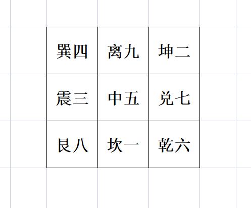 一坎、二坤、三震、四巽、五为中宫(为无)、六乾、七兑、八艮、九离。