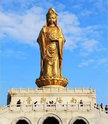 浙江舟山市普陀山的南海观音造像,1997年建成,总高33米。其顶现弥陀,左手托法轮,右手施无畏印,妙状、慈祥。中国佛教协会赵朴初会长为圣像题名“南海观音”,现已成普陀山重要宗教景观。在《西游记》中,观音菩萨的全名就叫作“南海普陀落伽山大慈大悲救苦救难灵感观世音菩萨”。