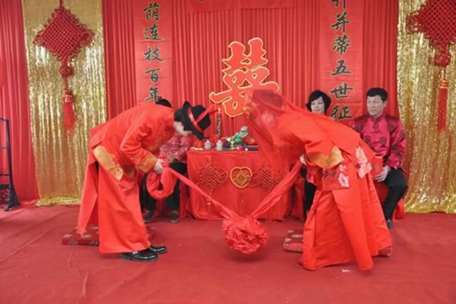 3.夫妻对拜,女东男西,对面而立,相距约一步距离,互磕三个头,而后相拥站立起来。