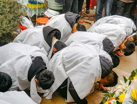 2.一步一拜一叩,一般也是至亲之人,多为几个人排成两行,前后左右等距离。大家行动一致,走一步,作个揖,双膝跪地,磕个头。站起来,再走一步,作个揖,双膝跪地,再磕个头。正常下,是总共走九步,多的为十二步不等。