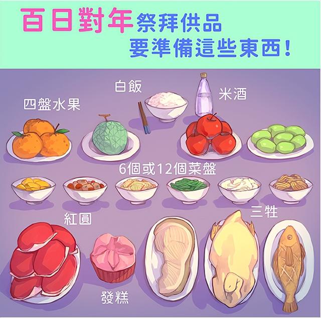 逝者往生后的一百天,以当日算起,祭拜礼仪不一定会办在第一百天,大部分在第九十五到一百天之间,依家人方便时间即可;或是一百天扣除家中男丁和长孙的人数,如亡者育有五男、二长孙,则一百天扣除七天,则在第九十三天祭拜。主要是祭祀,以饭菜和水果点心祭拜,部分较讲究人家,会请法师或道士为逝者诵经超渡。