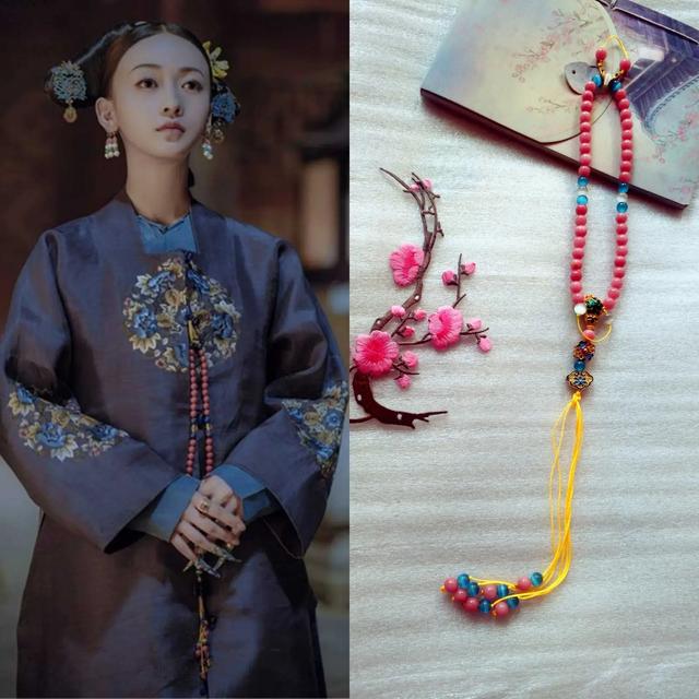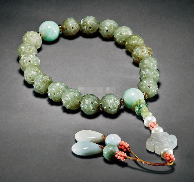 实际上,十八子的形式在晚清就已经流行起来,起初主要是佩戴在手腕或者持拿在手中,与念珠类似。不过从道光时期开始,十八子便衍生出了另外一种使用方法——佩挂。具体而言,即是通过佛头左右的丝线提系,佩挂在穿着的袍、褂的衣襟上。若是斜襟,则佩戴在右前方,若是对襟,则佩戴在对襟的第二个纽襻上。以晚清的记录来看,佩挂是十八子最流行的一种使用方式,而且不限男女和身份地位,大家都可以佩戴。十八子手串选材也十分丰富华贵,多用碧玺、翡翠、青金石、玛瑙、蜜蜡、东珠、沉香等珍奇,配珠也有琉璃、水晶、珐琅等各色。