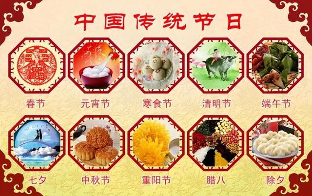 中国的传统节日主要有春节(正月初一)、元宵节(正月十五)、龙抬头(二月二)、社日节(二月二)、清明节(公历4月5日前后)、端午节(农历五月初五)、七夕节(农历七月初七)、中元节(农历七月十四/十五)、中秋节(农历八月十五)、重阳节(农历九月九)、冬至节(公历12月21~23日)、除夕(年尾最后一天)。