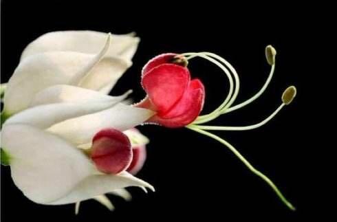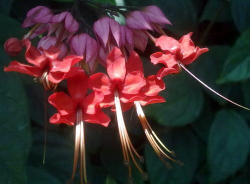 龙吐珠是多年生藤本植物,叶深绿色,长圆形,蜡纸。春、夏都能开花,花型好看,红色的花冠丛白色或红色的萼片中伸出,就像游龙吐珠,非常优美。