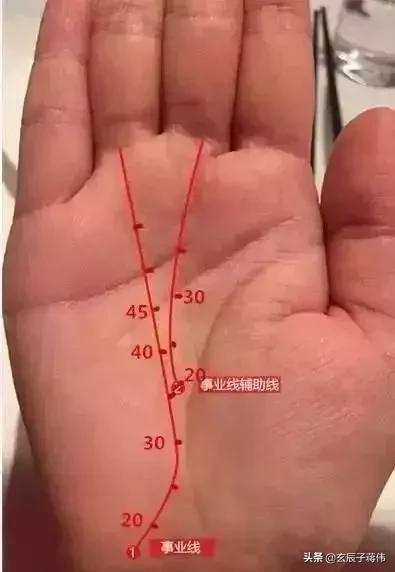 事业线有两条,主线深长,但下垂,本来事业运虽有,可是到来时辰很晚,约莫45岁。