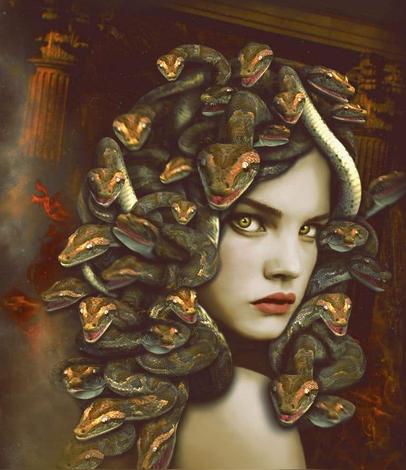 美杜莎是希腊神话中的蛇发女妖,她之前是一位很艳丽的美女,由于过度自大和自信就站在了雅典娜的面前高声大喊自己比神都美丽,于是就被变成了蛇发女妖。她长有满头的蛇发,及一对野猪的獠牙,就连脖子上都长满了蛇的鳞片,甚至下身也变成了蛇的样子,于是智慧女神赐予了她一对任何看到她们的人都会立即变成石头的双眼。